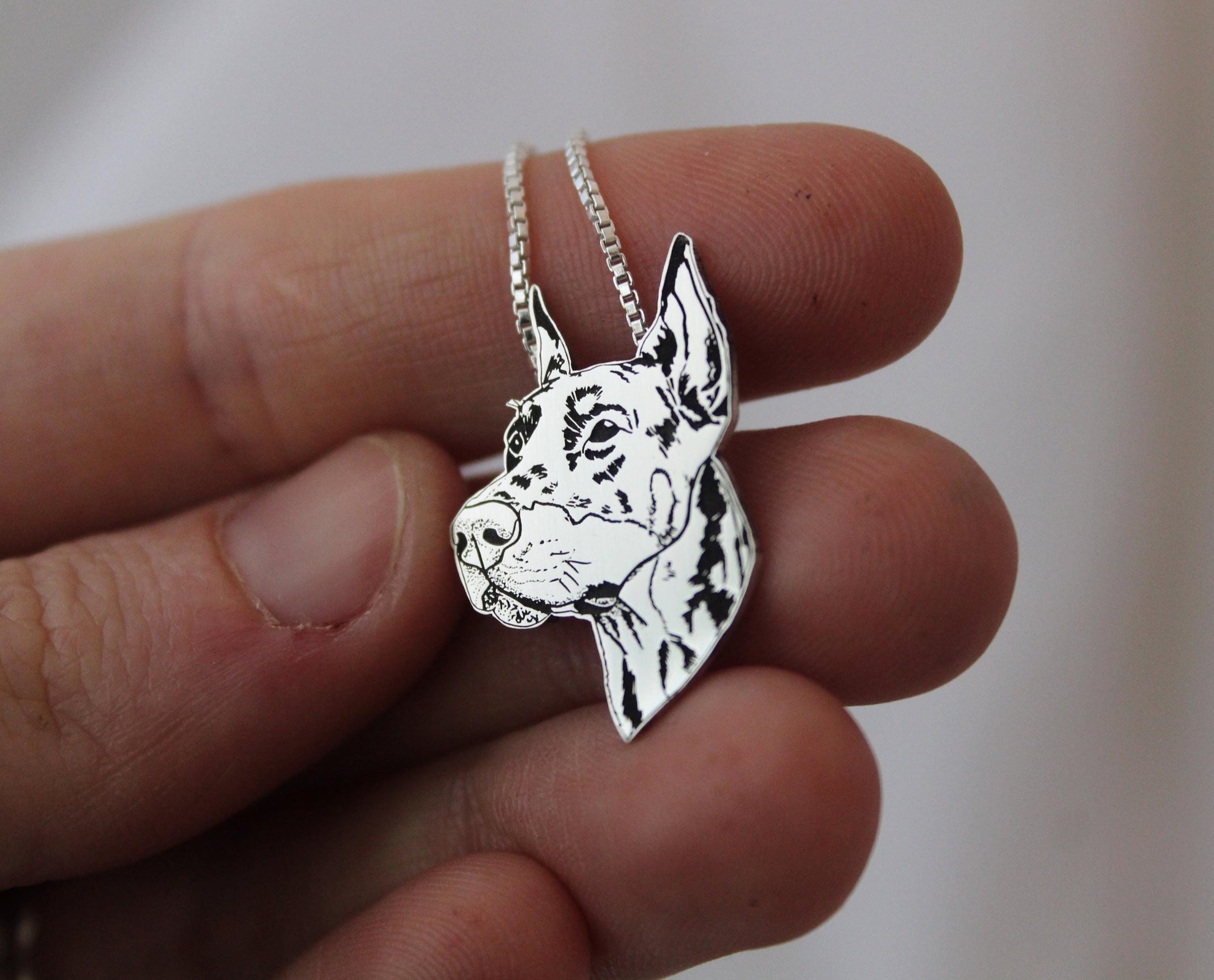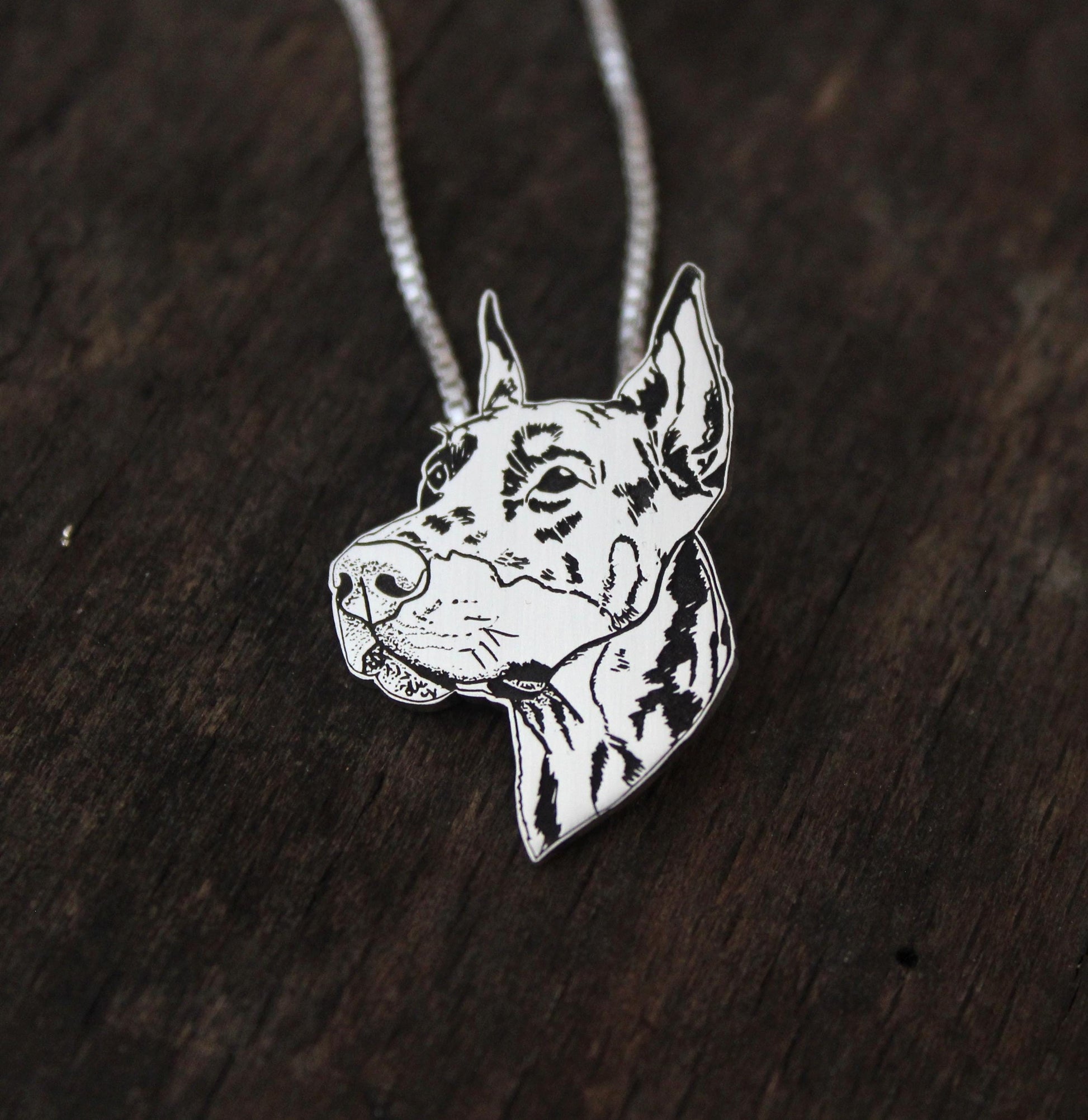 This 925 Sterling Silver Doberman Pincher necklace is carefully crafted in my home studio, beginning with an accurate design, precisely cut to shape in-house and finished entirely by hand. Each piece is polished to a soft shine, highlighting every detail. Because every pendant is created one at a time, great care is taken to ensure a quality pendant and become a treasured keepsake.
