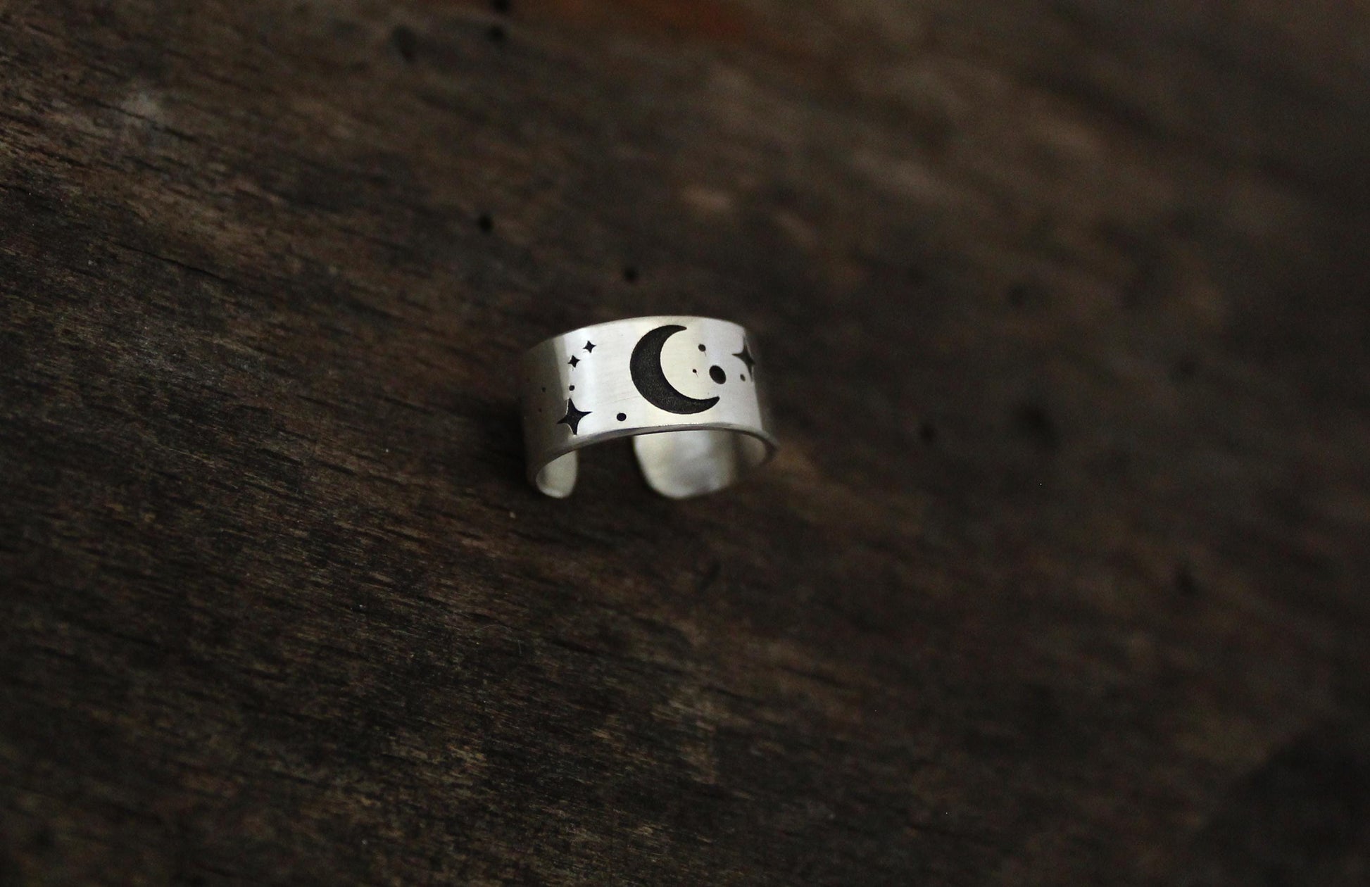 Crescent moon and stars Ear Cuff, engraved sterling silver