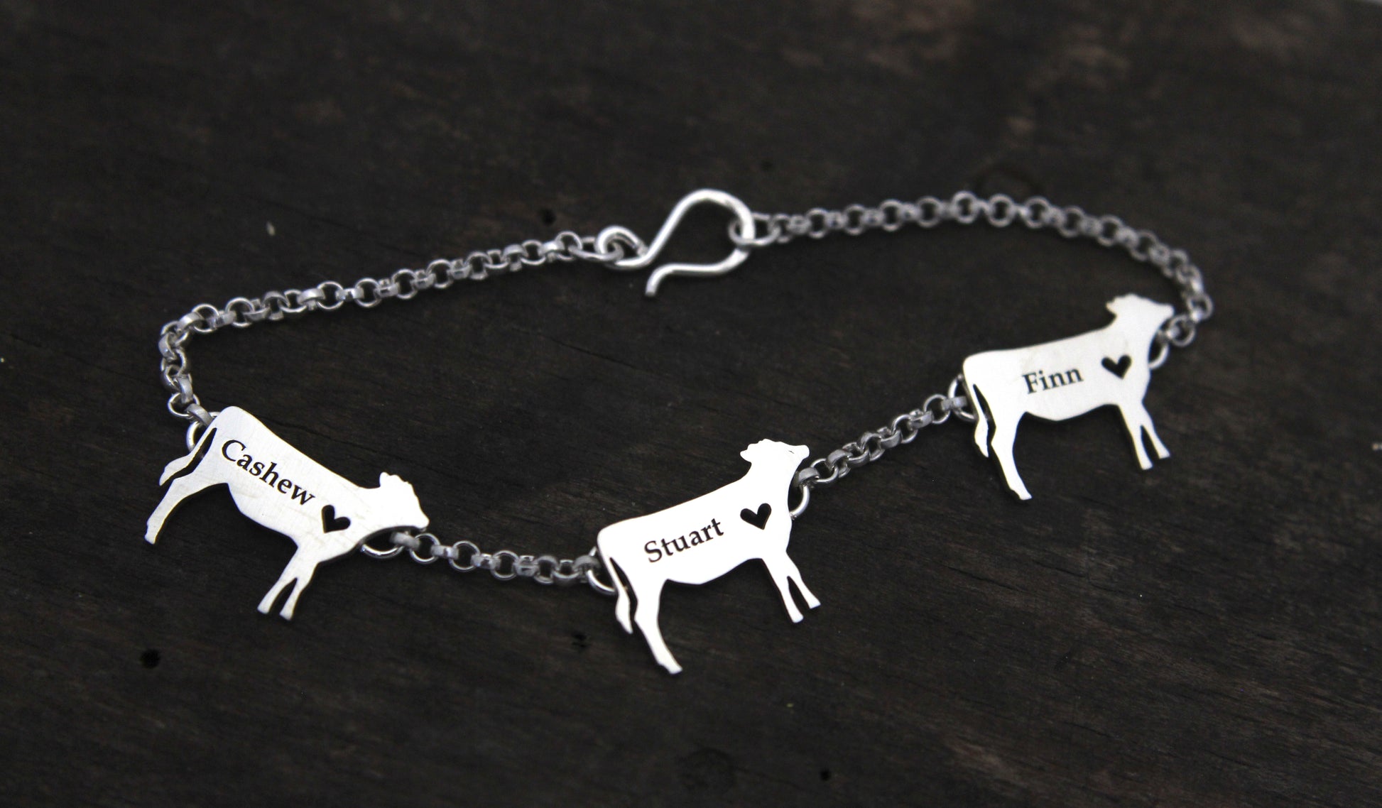 This sturdy, yet delicate Sterling Silver Jersey Cow bracelet is carefully crafted in my home studio, beginning with an accurate design, precisely cut to shape in-house and finished entirely by hand. Each piece is polished to a soft shine, highlighting every detail. Because every bracelet is created one at a time, great care is taken to ensure a quality piece of jewelry and become a treasured keepsake.